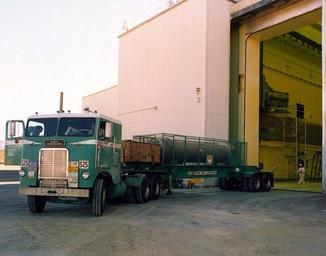 | Keywords: NTS - EMAD Facility 005.jpg  en Nevada Test Site - Nuclear Rocket Development Station A truck at the E-MAD building in Area 25 of the Nevada Test Site trucks brought the spent fuel rods from the Turkey Point reactor in Florida The fuel rods were remotely encapsulated in stainless steel canisters remotely welded shut and stored for transport in the Climax facility for underground radioactive waste storage investigations in granite 1018 WA-368 Federal Government of the United States 36 806459 -116 304649 PD-USGov NRDS E-MAD White-Freightliner WFT / Freightliner FLT Transport of nuclear waste containers Green trucks |