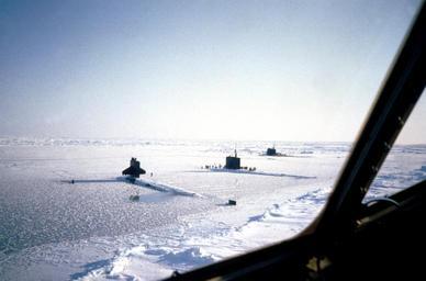 Keywords: Nuclear Submarines surfaced at the North Pole.jpg An elevated view of the attack submarines USS RAY SSN-653 USS HAWKBILL SSN-666 and USS ARCHERFISH SSN-678 surfaced at the geographic North Pole This is the first time three nuclear-powered submarines have simultaneously surfaced at the pole Shot 6 May 1986 PD-USN North Pole USS Archerfish SSN-678 USS Hawkbill SSN-666 USS Ray SSN-653 Submarines surfaced through polar ice |