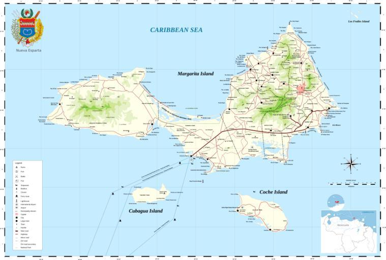 | Keywords: Nueva Esparta Map English.svg stato Nueba Esparta Estat de Nueva Esparta Nueva Esparta Karte von Nueva Esparta Nueva Esparta New Sparta is one of the 23 states estados of Venezuela It comprises Margarita Island by far the largest and most important island Coche and uninhabited Cubagua The state is the smallest one in area and is located off the northeast Caribbean coast of Venezuela It is the only insular state of Venuezuela Its name comes from the heroísm shown by its inhabitants during the Venezuelan War of Independence deemed similar to that of the Spartan soldiers of Ancient Greece The main island of Margarita alone has an area of 934 km² In 1909 the state was constituted and in 1947 the island of Cubagua was added Its capital city is La Asunción but the main urban center is Porlamar Nueva Esparta es un estado federal de Venezuela ubicado al noreste del país siendo el único Estado Federal insular y el de menor superficie de la nación El estado posee gran cantidad de monumentos históricos en la iglesia de Santa Ana fue declarada la Tercera República de Venezuela y Simón Bolívar su presidente El Estado fue designado con ese nombre a partir del 12 de mayo de 1817 con el propósito de hacer un homenaje al heroísmo de los habitantes de la isla de Margarita durante la guerra de Independencia de Venezuela calificado como Heroísmo espartano porque hizo recordar la valentía de los ciudadanos de la capital de la porción de Laconia Esparta en la península del Peloponeso en la antigua Grecia Aquí nacieron Luis Beltrán Prieto Figueroa Santiago Mariño y otros grandes personajes de la historia regional y nacional L État de Nueva Esparta « Nouvelle Sparte » est un des 23 États estados du Venezuela Il comprend les îles de Margarita de loin la plus grande et plus importante avec une surface de 934km² à elle seule Coche et Cubagua inhabitée C est le seul État insulaire du Venezuela et le plus petit de la région il est localisé sur la côte antillaise au nord-est du Venezuela Son nom vient de l héroïsme montré par ses habitants durant la guerre d indépendance vénézuelienne jugé semblable à celui des soldats spartiates de la Grèce antique L État a été constitué en 1909 et l île de Cubagua a été ajoutée en 1947 Sa ville capitale est Asunción mais le principal centre urbain est Porlamar Nueva Esparta Nueva Esparta ベネズエラ ヌエバ・エスパルタ州の 図 Nueva Esparta Nueva Esparta Nueva Esparta Nueva Esparta Nueva Esparta Estado de Nueva Esparta уэва-Эспа та Nueva Esparta Nya Sparta en delstat i Venezuela Иёлоти уэва Эспа та 新埃斯帕塔州 Own data obtained traveling across the zone with a GPS Miniature Venezuela map from File Venezuela Regiones Administrativas svg Coat of arms File Escudo Nueva Esparta svg 2015-10-14 User The Photographer/info cc-zero Map of Nueva Esparta svg Venezuela Nueva Esparta location map svg <gallery> File Division Politico Territorial Nueva Esparta svg File Nueva_Esparta_Mapa_Interactivo jpg </gallery> Translation possible Created with Inkscape Assessments 1 Nueva Esparta Map English Maps of Isla Margarita Maps of Nueva Esparta Maps of islands of Venezuela Drawings by The Photographer Files by The Photographer Images of Venezuela by User The Photographer Featured pictures by User The Photographer |
