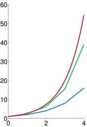 Keywords: Numerical integration illustration, h=1.png vector version available Numerical integration illustration step 1 svg Illustration of Numerical ordinary differential equations own Oleg Alexandrov Created with MATLAB Source code MATLAB <source lang matlab > illustration of numerical integration compare the Forward Euler method which is globally O h with Midpoint method which is globally O h 2 and the exact solution function main f inline 'y' 't' 'y' ; will solve y' f t y a 0; b 4; endpoints of the interval where we will solve the ODE N 5; T linspace a b N ; h T 2 -T 1 ; the grid y0 1; initial condition solve the ODE Y_euler solve_ODE N f y0 h T 1 ; Forward Euler method Y_midpt solve_ODE N f y0 h T 2 ; midpoint method T_highres a 0 1 b; Y_exact exp T_highres ; prepare the plotting window lw 3; curves linewidth fs 20; font size figure 1 ; clf; set gca 'fontsize' fs ; hold on; colors red 0 867 0 06 0 14; blue 0 129 205/256; green 0 200 70/256; plot the solutions plot T Y_euler 'color' blue 'linewidth' lw plot T Y_midpt 'color' green 'linewidth' lw plot T_highres Y_exact 'color' red 'linewidth' lw axes aspect ratio pbaspect 1 1 5 1 ; save to disk disp sprintf 'Grid size is 0 9g' h saveas gcf sprintf 'Numerical_integration_illustration _h 0 2g eps' h 'psc2' ; function Y solve_ODE N f y0 h T method Y 0 T; Y 1 y0; for i 1 N-1 t T i ; y Y i ; if method 1 forward Euler method Y i+1 y + h f t y ; elseif method 2 explicit one step midpoint method K y + 0 5 h f t y ; Y i+1 y + h f t+h/2 K ; else disp 'Don`t know this type of method' ; return; end end </source> Images with Matlab source code Numerical analysis Files by User Oleg Alexandrov from en wikipedia |