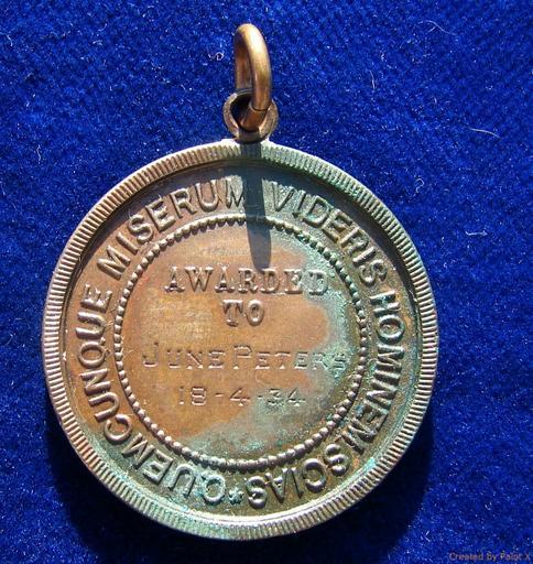| Keywords: NZ & AUS Royal Life Saving Medal Awarded 1934, reverse.jpg en Bronze medallion d 30 mm 3 mm thick With loop for ribbon suspension One swimmer rescuing the other one with his/her hands on the side of the head of the second person The whole bodies of both swimmers are clearly seen The background shore is indistinct Surrounding in a roman font THE ROYAL LIFE SAVING SOCIETY The edge of this side has a milled pattern / Around the edge that has a milled pattern QUEMCUNQUE MISERUM VEDERIS HOMINEM SCIAS which may be translated as ˜Whomsoever you see in distress recognize him as a fellow man ™ In the centre in two lines AWARDED TO followed by a space in which the recipient ™s name and the date of awarding were added JUNE PETERS 18 - 4- 34 Condition EXTREMELY FINE tarnish on the reverse 1910 own Berlin-George other versions cc-by-sa-4 0 PD-old-100 Uploaded with UploadWizard Numismatics Medals of New Zealand Medallions Lifesaving awards 1891 medals 1934 medals |