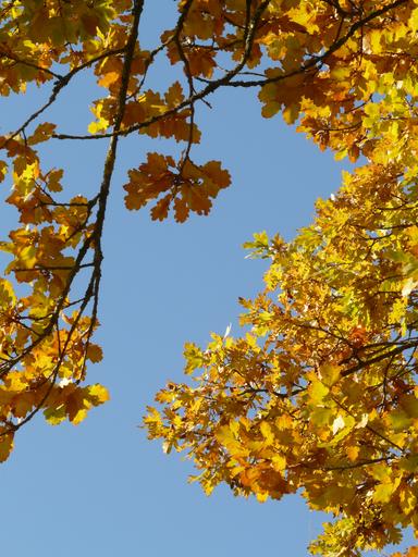 Keywords: oak leaves oak quercus sessile oak quercus petraea winter oak golden autumn golden october autumn october forest leaves golden bright sun back light colorful color tree road fall foliage