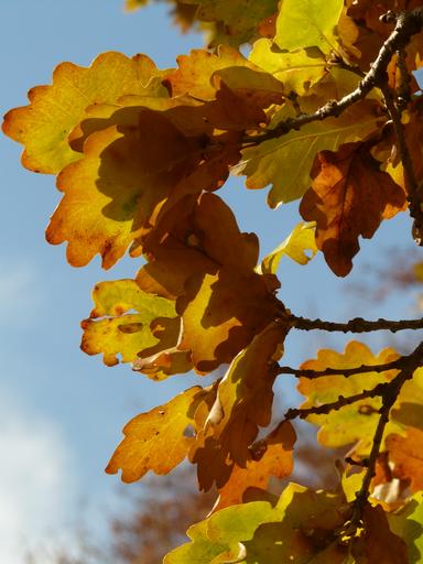 Keywords: oak leaves oak quercus sessile oak quercus petraea winter oak golden autumn golden october autumn october forest leaves golden bright sun back light colorful color tree road fall foliage