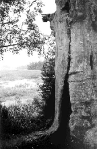 Keywords: Oak small.gif sv En ca 500 gammal ihålig ek vid Magelungens norra strand fotograferat 1959 Trädet hade en kavitet av ca 1 5 m vid marknivå och det var möjligt att stiga in i trädet via den trånga öppningen som låg otillgänglig mot en brant Trädet har rapporterats till naturhistoriska riksmuseet som boträd för en för vetenskapen okänd eldfluga som lyste med grönt gult och rött ljus vilket gör den unik i sitt slag Inget exemplar av eldflugorna har fångats men det färggranna ca 2 5 cm breda ljuset från tre st av dem fotograferades ca 1 km därifrån 1986 under deras nattliga vandring ett tekniskt bevis I trädet hade år 1971 en förbipasserande observerat 5-8 st av dem som lyste starkt mitt på dagen i det mörka utrymmet Inget exemplar fångades och arten kanske försvann när trädet avlägsnades av säkerhetsskäl 1999 efter att eldhärjats i samband med att en rad bränder anlagts i området samma år som den förödande branden i Tyresta nationalpark varför ett samband inte kan uteslutas Vinddrivna figurer huserar i området Resterna av den svedda stammen vittrar snabbt bort own GreenSweden Cc-zero Trees in Sweden Magelungen |