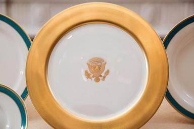 | Keywords: obama china service obamachinaservice white house china whitehousechina pickard china pickardchina 2015 white house china 2015whitehousechina porcelain american porcelain americanporcelain white house porcelain whitehouseporcelain obama porcelain obamaporcelain round circle A "charger" plate in the Obama White House china service, which was introduced on April 27, 2015. This photograph was taken by a White House photographer. As the work of an employee of the federal government created in the performance of his/her duties, it is in the public domain. The White House must order new china about once every 10 years, depending on wear and tear. Recent past colors have included celadon green (Truman), white (with flowers; Johnson), red (Reagan), gold (Clinton), and gold (G.W. Bush). Although dark blue has been used on previous orders of White House china (both the F.D. Roosevelt and Wilson services used it), the type of light blue used by the Obamas has never been used before on American state china. The new Obama service porcelain was designed by First Lady Michelle Obama, with assistance from her friend, the interior designer Michael S. Smith. Planning for the new china began in the fall of 2011, and Obama consulted White House chefs (past and present), White House staff, and the Pickard China company of Illinois on the design and style of the porcelain, pieces, and color. White House dinners are growing ever-larger in size. Existing White House china settings are often used together, mixed and matched so that 400-, 500-, and even 600-setting dinners can be given. Michelle Obama was constrained by the need to design a china service that mixed well with existing china, but which reflected the Obamas' own personal style and tastes. The Obama china service made its debut on April 27, 2015. It was first used on April 28 for a state dinner for Japanese Prime Minister Shinzo Abe. Each setting has 11 pieces and there are 320 settings, for a total of 3,520 pieces in the entire service. The "service plate" or "charger" is the largest piece in the set at 14 inches. A charger is designed to be a placeholder, so that each diner knows to "sit here". As the meal is served, additional elements of the service are placed atop the charger. The charger helps protect the tablecloth from spills, but it also helps act as an aesthetic backdrop to the other pieces of china. The Obama chargers feature a lip of gold gilt, impressed with a fret (Greek key pattern). There is a narrow band of plain gilt on the rim next to the lip, with the rest of the rim in fluted gold gilt. A narrow band of plain gold gilt is placed just inside the well. In the center of the charger is the Presidential coat of arms in gold. The seal should be the first thing the diner sees when they are seated. Each dinner plate is 12 inches in diameter. The lip of the dinner plate is plain gold gilt. The broad rim of the plate lacks gilding or color, and is decorated with pinwheels and fronds in bas-relief. The bas-relief design was taken from an Empire-style china service purchased by then-Secretary of State James Madison in 1806. The bas-relief element is unique to White House china, which has never featured anything like it before. The Obama china service also includes a "second course" 11-inch dinner plate, a 10-inch luncheon plate, a 9-inch salad plate, a 9-inch dessert plate, a 7-inch tureen plate, and a 6-inch saucer. Each of these plates has a lip in gold gilt, impressed with a fret-oval-and-dart motif. Each motif is separated by a double row of dots. The rim of the plate is in a new color designed specifically for the Obama china service. This color is named "Kailua Blue," a bright blue inspired by the hue of the sea in President Barack Obama's home state of Hawaii. The fluted rim of blue is followed by a delicate inner line of gold gilt which completes the decoration. Only about half the rim is taken up by design and color. The dessert plate, the last plate the diner should see, also has the Presidential coat of arms in gold gilt in the center. Each setting comes with a coffee cup. The cup has a lip of plain gold gilt, followed by a narrow band of gold gilt in a dart-oval-dart motif set perpendecular to the lip. This is followed by a band of fluted Kailua blue, and then a delicate band of plain gold gilt again. Each cup has the Presidential coat of arms; if held by the right hand, the coat of arms faces the guest. Unique to the Obama china service is an individual tureen. Although large tureens have been part of White House china before, this is the first time an individual-sized tureen has been designed. The tureen reflects a more modern style of dining, which emphasizes soups, small entrees, or desserts requiring more than a bowl but not a large tureen. Each tureen is small, about 6 inches across. Handles on the side of the tureen are plain, consisting of a scroll with one acanthus leaf above and three below (helping to reinforce the scroll). Each tureen is about 4 inches deep. The lip of the tureen is plain. The rim is designed with the same plain pinwheels-and-fronds design in bas-relief. Below the rim, the side of the tureen is decorated with a narrow band of Kailua blue edged in a delicate line of gold gilt. The lid of the tureen is plain, with a mushroom-motif handle. The cap of the mushroom is fluted, with a botton topping the cap. Pickard China produced the dinnerware. The tureen was incredibly difficult to make. It took workers more than a year and innumerable trials to produce the tureen. The china service was paid for by the White House Historical Association -- a private foundation established by Jacqueline Kennedy to buy furniture, china, and decorative and fine art for the White House. The service cost $367,258. A "charger" plate in the Obama White House china service, which was introduced on April 27, 2015. This photograph was taken by a White House photographer. As the work of an employee of the federal governm