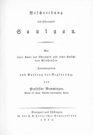 Keywords: Oberamt Saulgau 002.jpg de Dies ist ein Scan des Buches en This is a scan of the book Beschreibung des Oberamts Saulgau J G Cotta'sche Buchhandlung heute Teil des Landkreises Sigmaringen Baden-Württemberg Source de Scan einer Faksimileausgabe Bissinger Magstadt 1982 ISBN 3-7644-0006-4 en Scan from facsimile edition Bissinger Magstadt 1982 ISBN 3-7644-0006-4 Date 1829 Author Johann Daniel Georg von Memminger Stuttgart 1773-1840 PD-old Beschreibung des Oberamts Saulgau