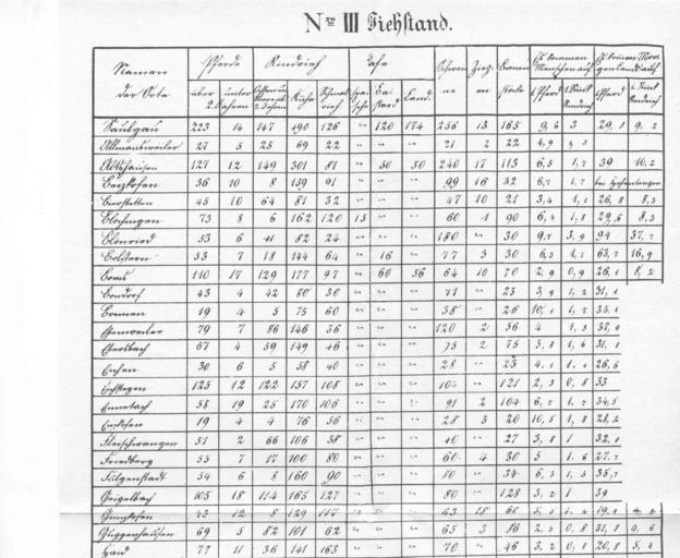 Keywords: Oberamt Saulgau Tabelle 3a.jpg de Dies ist ein Scan des Buches en This is a scan of the book Beschreibung des Oberamts Saulgau J G Cotta'sche Buchhandlung heute Teil des Landkreises Sigmaringen Baden-Württemberg Source de Scan einer Faksimileausgabe Bissinger Magstadt 1982 ISBN 3-7644-0006-4 en Scan from facsimile edition Bissinger Magstadt 1982 ISBN 3-7644-0006-4 Date 1829 Author Johann Daniel Georg von Memminger Stuttgart 1773-1840 Beschreibung des Oberamts Saulgau PD-old |