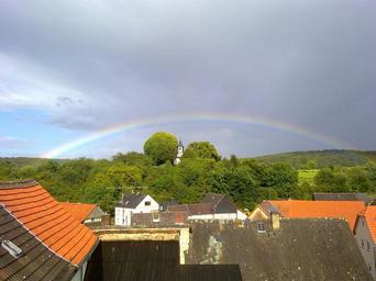 Keywords: oberlauken germany town sky clouds rainbow buildings rooftops forest trees woods beautiful scenic nature outside country countryside summer spring