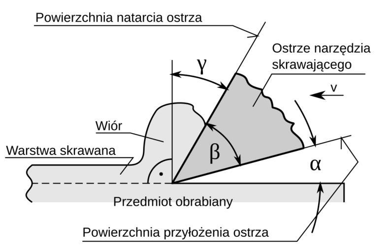 Keywords: Obrobka skrawaniem.svg en Machining diagram pl Schemat skrawania <br>α - kąt przyłożenia<br>β - kąt zaostrzenia<br>γ - kąt natarcia own Swisstack 2010-08-31 100px Machining