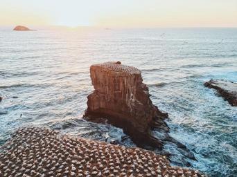 Keywords: ocean coast birds flock perched many aerial view cliffs aerial sea nature water