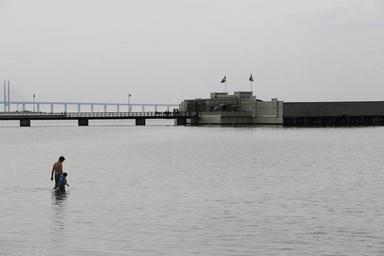 Keywords: ocean oresund sweden sea bath pier jetty persons dad child family water grey autumn season bridge famous building