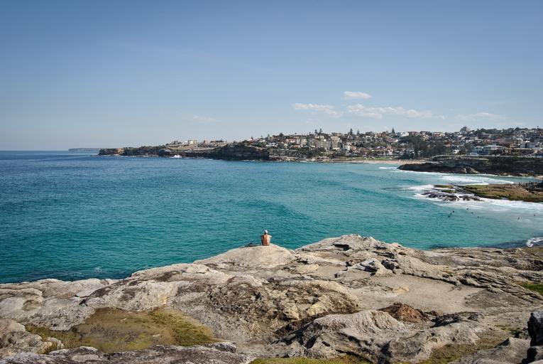 Keywords: ocean sea shore coast rocks water nature bay cove town city person sitting looking view panorama summer beach travel vacation sun holiday seascape turquoise tranquil seaside
