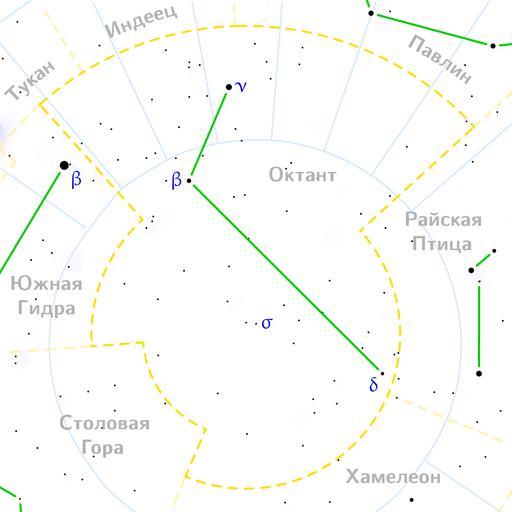 Keywords: Octans constellation map ru lite.png en Octans constellation map on Russian ru Ка та созвездия Октанта на усском языке It was created using the program PP3 At http //pp3 sourceforge net PP3's homepage you also get the input scripts necessary for re-compiling the map The yellow dashed lines are constellation boundaries the red dashed line is the ecliptic and the shades of blue show Milky Way areas of different brightness The map contains all Messier objects except for colliding ones The underlying database contains all stars brighter than 6 5 All coordinates refer to equinox 2000 0 The map is calculated with the equidistant azimuthal projection the zenith being in the center of the image The north pole is to the top The horizontal lines of equal declination are drawn for 0° +10° +20° etc The lines of equal rectascension are drawn for all 24 hours Towards the rim there is a very slight magnification and distortion own 2006-10-17 Denis Ibaev Constellations maps russian |