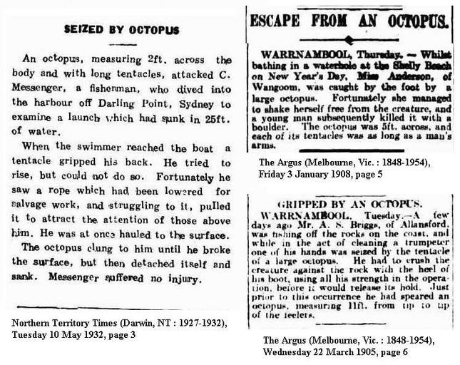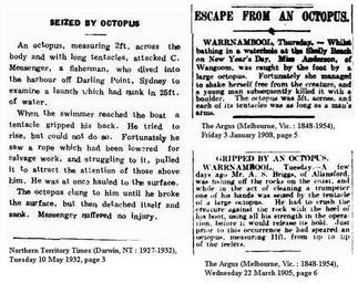 | Keywords: Octopus attacks newspapers 1905 1908 1932.jpg en from the http //www nla gov au/ndp/ National Library Australian newspapers digitisation program which are pre-1955 so no copyright The service includes newspapers published in each state and territory from the 1800s to the mid-1950s when copyright applies http //www nla gov au/ndp/ National Library Australian newspapers digitisation program Northern Territory Times The Argus 1905 1908 1932 PD-Australia Octopus National Library of Australia - Australian Newspapers Service |