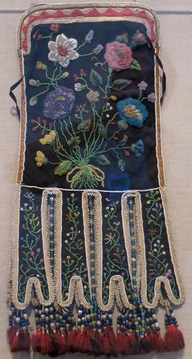| Keywords: Octopus bag, Athabascan people, Honolulu Museum of Art, accession 13734.1.JPG  Octopus bag Athabascan people early 20th century black wool trade cloth glass and metal beads silk ribbon work and binding glazed cotton cloth lining hide natural and dyed porcupine quills wool yarns commercial buttons Honolulu Museum of Art accession 13734 1 own photo 2014 Hiart Cc-zero Native American textiles in the Honolulu Museum of Art Athabaskan Native American beaded bags and pouches Octopus bags Textiles of the United States in the Honolulu Museum of Art |