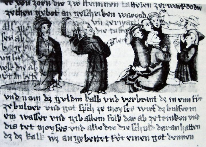 Keywords: Oetenbach Handschrift.jpg illustrierte Pergamenthandschrift aus dem Frauenkloster Oetenbach; ca 1455 -1460 Inhalt Als Moyses ab dem berg kam unf sach dz volk die abgoet anbeten und zerwarf die taffelen Sigmund Widmer Zürich eine Kulturgeschichte Band 3 2008-05 upload by Adrian Michael PD-old Kloster Oetenbach |