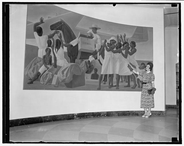 Keywords: Off with the yoke of Uncle Sam depicted in post office mural 23336v.jpg en Mail Service to the Tropics 1935-36 by Rockwell Kent U S Post Office Building Washington D C The mural is now in the Smithsonian American Art Museum <br> Off with the yoke of Uncle Sam depicted in post office mural is charge of Arctic explorer Washington D C Sept 10 Vilhjamur Stefansson the Artic explorer today charged that artist Rockwell Kent had painted on the wall in the Post Office Building here an exhortation to Puerto Rico to throw off American Rule The gibberish says Stefansson s translated by his friends and reads To the people of Puerto Rico our friends go ahead let change chiefs That alone can make us equal and free Postmaster General Farley passes the mural each day as he goes to his office Miss Mary eveling is viewing the mural in this picture 9/10/37 Creator s Harris Ewing photographer Date Created/Published 1937 September 10 Medium 1 negative glass ; 4 x 5 in or smaller Reproduction Number LC-DIG-hec-23336 digital file from original negative Rights Advisory No known restrictions on publication Call Number LC-H22- D-2314 P P Repository Library of Congress Prints and Photographs Division Washington D C 20540 USA http //hdl loc gov/loc pnp/pp print Notes Title from unverified caption data received with the Harris Ewing Collection Gift; Harris Ewing Inc 1955 General information about the Harris Ewing Collection is available at http //hdl loc gov/loc pnp/pp hec Temp note Batch five 1937 LOC-image hec 23336 Harris Ewing photographer PD-Harris-Ewing other versions Ariel Rios Federal Building murals Uploaded with UploadWizard Rockwell Kent