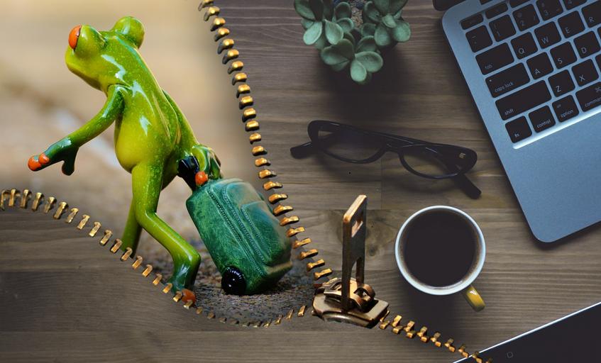 Keywords: office work holiday recovery frog funny leisure laptop desk computer workplace profession business office job travel go away holidays