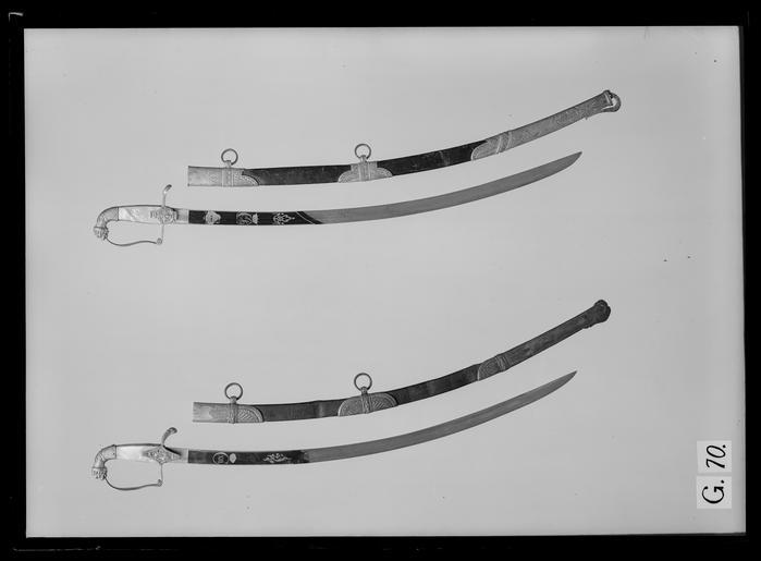 | Keywords: Officerssabel, Frankrike 1809-1818, tillåten modell, Sverige - Livrustkammaren - 77821.tif Fäste av förgylld reliefornerad mässing kavelns sidostycken av pärlemor <br/>Kappa framtill i form av ett lejonhuvud med manen inramad av en slät list och baktill övergående i ett insvängt och nedåtböjt mellanled på vars översida ett palmettliknande ornament Nederdelen formad som en nedåtriktad fjällmönstrad holk Handbygel platt överdelen intappad i lejonets gap nederdelen något inåtböjd och med ett spiralornament rätvinkligt övergående i den raka främre parerstången med en längsgående bladranka något ovanför mitten en infälld trofégrupp Bakre parerstång böjd nedåt-utåt ytteränden formad som en palmett Styrskenor stora rombiska med insvängda sidor och tvärt avskurna hörn ornerade med en bröstbild av Minerva <br/><br/>Kavel med rektangulärt tvärsnitt något avsmalnande uppåt de smala fram- och baksidorna belagda med bård av förgylld mässing ornerad med en längsgående tuktad lagerranka bården på framsidan saknas <br/><br/>Klinga böjd eneggad med hålkäl Starka delen med etsad och förgylld ornering mot blånerad botten upptill tvärt avskuren ryggpartiet blånerat med förgyllda kanter Baspartiet även på ryggsidan till en längd av 48 mm helt förgylld översidan tvärt avskuren Härovanför ett stort C åtföljt av XIII och krönt med kunglig krona Upptill ett ornament av två sammanslingrade bladkvistar den ena en palmkvist original caption - 1809 1818 brass b1 - blankvapen - fäste material mässing - mother-of-pearl b6 - blankvapen - kavel och kavelklädsel material pärlemor - steel b2 - blankvapen - klinga material stål size mm 942 size mm 114 size mm 808 klinga size mm 29 klinga g 720 LRK Henrik J Nauckhoff Friherre Gustav Vasa tur och retur Basutställning C XIII krönt av kunglig krona anv b5 - blankvapen - klingdekor; Karl XIII av Sverige -Norge C XIII krönt av kunglig krona anv b5 - blankvapen - klingdekor; Karl XIII av Sverige -Norge place of origin original filename LN_B04889_007769 49842 inventory number LRK 13314 77821 CC0 Officerssabel Frankrike 1809-1818 tillåten modell Sverige - Livrustkammaren - 77821-negative tif Media contributed by LSH dim-with multiple size templates Sabre images from Livrustkammaren Sabres of France Sabres of Sweden Media contributed by LSH 2013-10 |