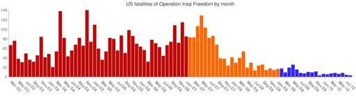 | Keywords: OIF fatalities by month.png Operation Iraqi Freedom by month from beginning to end Based on http //chart apis google com/chart chxr 0 0 140 chxt y chbh a chs 1000x225 cht bvg chco FF6600 chds 0 137 chd t 65 74 37 30 48 35 31 44 82 40 47 20 52 135 80 42 54 66 80 64 137 72 107 58 35 52 80 78 54 85 49 96 84 68 62 55 31 76 69 61 43 65 72 106 70 112 83 81 81 104 126 101 80 84 66 38 37 23 40 29 39 52 19 29 13 23 25 14 17 14 16 17 9 19 25 15 8 7 10 9 11 3 6 5 7 8 6 8 4 3 chtt US+fatalities+of+Operation+Iraqi+Freedom+by+month this Google Chart API graph with further editing in Photoshop The red months are pre-troop surge the orange months are post-troop surge and the blue months are under Obama Although overall month-on-month figures have decreased the total level of coalition forces has also reduced Graph entirely my own work statistics provided by http //icasualties org/Iraq/ByMonth aspx iCasualties 2010-09-20 Smurfy thumb left Convert to SVG Smurfy Original upload log en wikipedia OIF+fatalities+by+month png wikitable - 2013-01-15 17 04 1011×288× 22536 bytes Acaudel <nowiki>Reverted to version as of 16 52 15 January 2013</nowiki> - 2013-01-15 17 03 1000×225× 14782 bytes Acaudel <nowiki>Reverted to version as of 21 46 9 July 2011</nowiki> - 2013-01-15 16 52 1011×288× 22536 bytes Acaudel <nowiki>Trying again Sorry about the multiple uploads Added dates on the bottom Please double check the dates to ensure accuracy </nowiki> - 2013-01-15 16 51 1011×288× 22536 bytes Acaudel <nowiki>Added dates on the bottom Please double check the dates to ensure accuracy </nowiki> - 2013-01-15 16 48 1011×288× 22536 bytes Acaudel <nowiki>Added dates on the bottom Please double check the dates to ensure accuracy </nowiki> - 2011-07-09 21 46 1000×225× 14782 bytes Smurfy <nowiki>Corrected troop surge date to February removed post-war fatalities as they are not part of Operation Iraqi Freedom</nowiki> - 2011-06-15 02 07 1000×225× 15413 bytes Mark Schierbecker <nowiki>post war fatalities</nowiki> - 2010-09-20 18 41 1000×225× 14801 bytes Smurfy <nowiki> Summary A bar graph showing the complete US fatalities from Operation Iraqi Freedom by month from beginning to end Based on http //chart apis google com/chart chxr 0 0 140 chxt y chbh a chs 1000x225 cht bvg chco </nowiki> Casualties of the Iraq War |