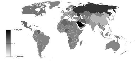 | Keywords: Oil Balance.png economic map en Oil exports minus oil imports bbl/day CIA - The World Factbook https //www cia gov/library/publications/the-world-factbook/rankorder/2176rank html Oil exports and https //www cia gov/library/publications/the-world-factbook/rankorder/2175rank html Oil imports Emilfaro en 2009-04-06 GunnMap The data wikitable center style background f0f0f0; Country center style background f0f0f0; Exports center style background f0f0f0; Imports center style background f0f0f0; Net - Saudi Arabia 8 200 000 41 680 8 158 320 - Russia 5 170 000 54 000 5 116 000 - Iran 2 800 000 210 000 2 590 000 - United Arab Emirates 2 703 000 232 300 2 470 700 - Kuwait 2 356 000 8 022 2 347 978 - Nigeria 2 473 000 154 300 2 318 700 - Norway 2 310 000 92 650 2 217 350 - Venezuela 2 203 000 0 2 203 000 - Algeria 1 844 000 13 110 1 830 890 - Mexico 2 204 000 385 400 1 818 600 - Iraq 1 830 000 104 300 1 725 700 - Libya 1 455 000 575 1 454 425 - Angola 1 230 000 19 550 1 210 450 - Kazakhstan 1 236 000 127 600 1 108 400 - Qatar 1 026 000 0 1 026 000 - Canada 2 225 000 1 229 000 996 000 - Azerbaijan 795 600 4 267 791 333 - World 66 190 000 65 410 000 780 000 - Oman 593 700 15 440 578 260 - Ecuador 421 700 47 060 374 640 - Equatorial Guinea 375 400 1 070 374 330 - Argentina 339 900 23 380 316 520 - Colombia 294 000 12 480 281 520 - Sudan 282 100 7 558 274 542 - Yemen 336 600 62 850 273 750 - Gabon 255 500 2 485 253 015 - Malaysia 546 300 308 500 237 800 - Congo Republic of the 230 200 1 702 228 498 - Brunei 200 000 304 199 696 - Chad 176 700 1 492 175 208 - Denmark 320 000 164 000 156 000 - Vietnam 394 400 271 100 123 300 - United Kingdom 1 749 000 1 673 000 76 000 - Egypt 204 700 140 000 64 700 - Cameroon 108 800 50 750 58 050 - Turkmenistan 40 000 5 283 34 717 - Bahrain 238 900 221 500 17 400 - Papua New Guinea 39 310 24 150 15 160 - Cote d\'Ivoire 84 940 71 850 13 090 - Congo Democratic Republic of the 19 820 8 220 11 600 - Bolivia 18 500 8 600 9 900 - Niue 0 27 -27 - Turks and Caicos Islands 0 84 -84 - Saint Helena 0 85 -85 - Falkland Islands Islas Malvinas 0 249 -249 - Kiribati 0 259 -259 - Cook Islands 0 476 -476 - Montserrat 0 483 -483 - Saint Pierre and Miquelon 0 557 -557 - British Virgin Islands 0 650 -650 - Sao Tome and Principe 0 660 -660 - Dominica 0 670 -670 - Vanuatu 0 671 -671 - Comoros 0 755 -755 - Saint Kitts and Nevis 0 918 -918 - Tonga 0 1 035 -1 035 - Nauru 0 1 049 -1 049 - Samoa 0 1 128 -1 128 - Bhutan 0 1 152 -1 152 - Solomon Islands 0 1 426 -1 426 - Saint Vincent and the Grenadines 0 1 460 -1 460 - Lesotho 0 1 500 -1 500 - Cape Verde 0 1 785 -1 785 - Grenada 0 1 844 -1 844 - Western Sahara 0 1 925 -1 925 - Central African Republic 0 2 057 -2 057 - Gambia The 42 2 123 -2 081 - Guinea-Bissau 0 2 560 -2 560 - Saint Lucia 0 2 631 -2 631 - Burundi 0 2 635 -2 635 - Cayman Islands 0 2 818 -2 818 - Laos 0 3 036 -3 036 - Suriname 2 899 6 369 -3 470 - Swaziland 0 3 530 -3 530 - Liberia 23 3 593 -3 570 - Cambodia 0 3 618 -3 618 - Maldives 1 499 5 362 -3 863 - Greenland 150 4 089 -3 939 - American Samoa 0 4 066 -4 066 - Bermuda 0 4 378 -4 378 - Antigua and Barbuda 158 4 556 -4 398 - Afghanistan 0 4 534 -4 534 - Faroe Islands 0 4 636 -4 636 - Somalia 0 4 772 -4 772 - Mali 0 4 860 -4 860 - Eritrea 55 4 924 -4 869 - Aruba 233 300 238 200 -4 900 - Syria 155 000 160 000 -5 000 - Macau 0 5 027 -5 027 - Belize 1 960 7 122 -5 162 - Niger 0 5 425 -5 425 - Rwanda 0 5 597 -5 597 - Seychelles 0 5 722 -5 722 - Montenegro 314 6 093 -5 779 - French Polynesia 0 6 271 -6 271 - Malawi 0 6 788 -6 788 - Sierra Leone 432 8 271 -7 839 - Fiji 2 848 10 900 -8 052 - Burkina Faso 0 8 446 -8 446 - Mauritania 14 990 23 630 -8 640 - Guinea 0 8 811 -8 811 - Barbados 1 750 10 710 -8 960 - Tajikistan N/A 10 100 -10 100 - Benin 6 484 16 830 -10 346 - Korea North 0 10 520 -10 520 - Guyana 0 10 960 -10 960 - New Caledonia 356 11 780 -11 424 - Uganda 115 11 540 -11 425 - Kyrgyzstan 2 534 14 240 -11 706 - Djibouti 19 11 810 -11 791 - Haiti 0 11 980 -11 980 - Nepal 0 12 500 -12 500 - Mozambique 0 13 240 -13 240 - Georgia 2 492 15 820 -13 328 - Guam 0 13 530 -13 530 - Zambia 191 13 810 -13 619 - Moldova 50 14 450 -14 400 - Botswana 0 14 500 -14 500 - Mongolia 2 902 17 680 -14 778 - Togo 1 547 16 650 -15 103 - Tunisia 73 790 89 130 -15 340 - Zimbabwe 0 15 800 -15 800 - Iceland 861 17 450 -16 589 - Madagascar 480 17 100 -16 620 - Burma 5 000 22 180 -17 180 - Namibia 0 17 750 -17 750 - Malta 0 18 910 -18 910 - Uzbekistan 11 940 31 440 -19 500 - Macedonia 6 768 26 470 -19 702 - Estonia 7 000 28 170 -21 170 - Mauritius 0 23 650 -23 650 - Albania 749 24 860 -24 111 - Gibraltar 0 25 080 -25 080 - Paraguay 0 25 940 -25 940 - Tanzania 0 26 760 -26 760 - Bosnia and Herzegovina 0 27 370 -27 370 - Nicaragua 809 29 700 -28 891 - Ethiopia 0 29 820 -29 820 - Bahamas The 38 740 69 780 -31 040 - Trinidad and Tobago 38 990 72 780 -33 790 - Latvia 10 070 45 340 -35 270 - Senegal 4 298 40 450 -36 152 - Uruguay 4 410 43 670 -39 260 - Ghana 5 709 45 520 -39 811 - El Salvador 4 963 45 210 -40 247 - Costa Rica 2 115 43 110 -40 995 - Honduras 418 44 040 -43 622 - Armenia 0 44 670 -44 670 - South Africa 267 700 319 000 -51 300 - Slovenia 4 535 59 110 -54 575 - Cyprus 0 55 970 -55 970 - Guatemala 15 560 72 960 -57 400 - Lithuania 148 400 206 700 -58 300 - Slovakia 72 240 134 100 -61 860 - Luxembourg 282 63 760 -63 478 - Serbia 3 641 70 760 -67 119 - Kenya 5 137 72 780 -67 643 - Jamaica 1 535 71 280 -69 745 - Netherlands Antilles 206 900 277 600 -70 700 - Peru 27 390 109 000 -81 610 - Bangladesh 1 351 83 220 -81 869 - Croatia 0 83 800 -83 800 - Panama 4 447 88 790 -84 343 - Sri Lanka 292 87 090 -86 798 - Romania 125 200 219 000 -93 800 - Virgin Islands 398 500 492 300 -93 800 - Lebanon 0 97 590 -97 590 - Hungary 66 660 178 400 -111 740 - Jordan 0 112 300 -112 300 - Dominican Republic 0 116 600 -116 600 - New Zealand 14 570 137 300 -122 730 - Cuba 0 123 200 -123 200 - Belarus 256 400 394 100 -137 700 - Bulgaria 2 480 145 200 -142 720 - Ireland 29