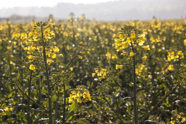 Keywords: oilseed rape agricultural operation yellow field harvest field of rapeseeds arable cultivation flower landscape spring morning light side light