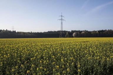 Keywords: oilseed rape agricultural operation yellow field harvest field of rapeseeds arable cultivation flower landscape power poles forest spring