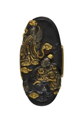 | Keywords: Oishi Akichika - Kashira with Weaving Maiden (Jp "Orihime") and the Shepard (Jp "Hikoboshi") - Walters 511091.jpg This kashira shows the yearly meeting of the celestial lovers the Weaving Maiden Jp Orihime and the Shepard Jp Hikoboshi They are the stars Vega and Altair Because they neglected their work when they were together the Weaving Maiden's father the King of Heaven decreed that they could only meet across the River of Heaven i e the Milky Way once a year Their meeting is celebrated on the 7th day of the 7th month with a festival called Tanabata The Weaving Maiden is shown at the upper left with spinning tools The Shepard is shown with an ox on the lower right This is part of a set with Walters 51 1090 middle Other date century 19 late Edo shakudo gold silver copper cm 3 4 l accession number 51 1091 31107 William T / Henry Walters Collection Baltimore date and mode of acquisition unknown Walters Art Museum Henry Walters Acquired by William T or Henry Walters none place of origin Edo present-day Tokyo Japan Walters Art Museum license Kashira in the Walters Art Museum Oishi Akichika Media contributed by the Walters Art Museum needs category review The Weaver Girl and the Cowherd |