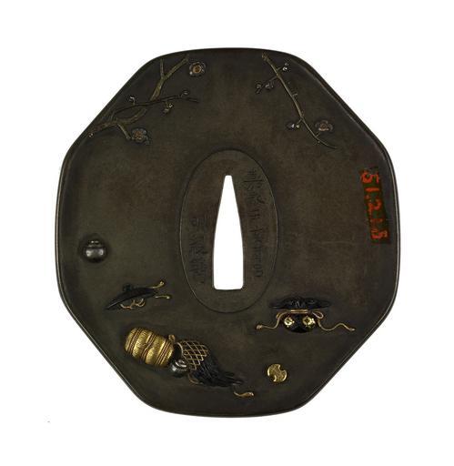 | Keywords: Oishi Akichika - Tsuba with the Treasures of the Seven Gods of Good Fortune - Walters 51215 - Back.jpg This tsuba shows a man gazing up at Mount Fuji surrounded by some of the attributes of the Seven Gods of Good Fortune These are the contents of the treasure bag carried by Hotei one of the gods The man rests against Hotei's bag Next to the bag is a sacred jewel At the bottom of the tsuba is Daitoku's hammer Just above the hammer is a sacred key The disk on the left with notches on two sides is a coin Mount Fuji can be seen in the upper left On the reverse branches of cherry blossoms frame the upper portion of the tsuba Along the bottom from right to left are an inexhaustible bag of money another coin a feather cape a bale of rice a hat the makes the wearer invisible and another treasure jewel 1851 late Edo shibuichi gold silver shakudo cm 9 8 4 0 45 accession number 51 215 13635 Henry Walters Baltimore date and mode of acquisition unknown Walters Art Museum Henry Walters Acquired by Henry Walters Inscrioption kaei kanotoi nanryo/akichika; Translation August 1851/Akichika place of origin Edo present-day Tokyo Japan Walters Art Museum license Tsuba in the Walters Art Museum Oishi Akichika Media contributed by the Walters Art Museum needs category review |