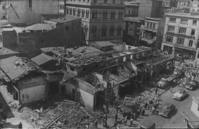 Keywords: salt araştırma saltaraştırma salt research saltresearch salt online saltonline karaköy yıkım karaköyyıkım karaköy yıkımları karaköyyıkımları menderes yıkımları menderesyıkımları i̇stanbul i̇mar projesi istanbulimarprojesi karaköy meydanı karaköymeydanı eski borsa han eskiborsahan nordstein han nordsteinhan yol genişletme yolgenişletme yıkım i̇stimlak istimlak karaköy demolition karaköydemolition eski borsa inn eskiborsainn old borsa inn oldborsainn nordstein demolition confiscation galata karaköy eski galata eskigalata old galata oldgalata eski i̇stanbul eskiistanbul old istanbul oldistanbul i̇stanbul istanbul galata borsa han galataborsahan galata borsa inn galataborsainn blackandwhite monochrome black and white www.archives.saltresearch.org/R/PFAAX8A3MP7NX97YTMB3HI8QM... Under the leadership of Adnan Menderes, the Democrat Party introduced the law “Public Works and Confiscation” in 1956, within the scope of the İstanbul Zoning Project. This extensive zoning program was presented as a solution to the excessive traffic problem in the city, to provide public spaces around historic building, and to enable the restoration of monumental buildings. The project design included large boulevards that would pass through historical areas such as Kemeraltı Street between Karaköy and Tophane. Karaköy was transformed by the connection of its six main streets to one square, with historical buildings such as Old Borsa Inn and Merzifonlu Kara Mustafa Paşa Mosque, designed by Raimondo D’aronco, being eradicated. Ultimately the implimentation of this law led to the dereliction of more than ten thousand Buildings. SALT Research, Photography Archive and Ali Saim Ülgen Archive Adnan Menderes liderliğindeki Demokrat Parti hükümeti, 1956’da İstanbul İmar Projesi kapsamında yeni bir imar kanunu, bir süre sonra da istimlak kanunu çıkardı. Geniş kapsamlı bu imar operasyonuna gerekçe olarak, kent içi trafiğin rahatlatılması, meydan ve camilerin çevrelerinin açılması ve dinî yapıların restore edilmesi gerekliliği gösterildi. Tarihsel dokunun yoğun olduğu yerlerden geçecek geniş bulvarların öngörüldüğü proje için, aralarında tarihî eserlerin de olduğu 10 binden fazla yapı istimlak edilerek yıkıldı. Karaköy-Tophane arasında kalan Kemeraltı Caddesi ve Karaköy-Azapkapı bağlantısı bu proje kapsamında hayata geçirildi. Altı ana caddesinin bir meydana bağlanması suretiyle dönüştürülen Karaköy’de, Eski Borsa Hanı ve Raimondo D’aronco tarafından tasarlanmış olan Merzifonlu Kara Mustafa Paşa Camii başta olmak üzere birçok tarihi yapı yok edildi. SALT Araştırma, Fotoğraf Arşivi ve Ali Saim Ülgen Arşivi www.archives.saltresearch.org/R/PFAAX8A3MP7NX97YTMB3HI8QM... Under the leadership of Adnan Menderes, the Democrat Party introduced the law “Public Works and Confiscation” in 1956, within the scope of the İstanbul Zoning Project. This extensive zoning program was presented as a solution to the excessive traffic problem in the city, to provide public spaces around historic building, and to enable the restoration of monumental buildings. The project design included large boulevards that would pass through historical areas such as Kemeraltı Street between Karaköy and Tophane. Karaköy was transformed by the connection of its six main streets to one square, with historical buildings such as Old Borsa Inn and Merzifonlu Kara Mustafa Paşa Mosque, designed by Raimondo D’aronco, being eradicated. Ultimately the implimentation of this law led to the dereliction of more than ten thousand Buildings. SALT Research, Photography Archive and Ali Saim Ülgen Archive Adnan Menderes liderliğindeki Demokrat Parti hükümeti, 1956’da İstanbul İmar Projesi kapsamında yeni bir imar kanunu, bir süre sonra da istimlak kanunu çıkardı. Geniş kapsamlı bu imar operasyonuna gerekçe olarak, kent içi trafiğin rahatlatılması, meydan ve camilerin çevrelerinin açılması ve dinî yapıların restore edilmesi gerekliliği gösterildi. Tarihsel dokunun yoğun olduğu yerlerden geçecek geniş bulvarların öngörüldüğü proje için, aralarında tarihî eserlerin de olduğu 10 binden fazla yapı istimlak edilerek yıkıldı. Karaköy-Tophane arasında kalan Kemeraltı Caddesi ve Karaköy-Azapkapı bağlantısı bu proje kapsamında hayata geçirildi. Altı ana caddesinin bir meydana bağlanması suretiyle dönüştürülen Karaköy’de, Eski Borsa Hanı ve Raimondo D’aronco tarafından tasarlanmış olan Merzifonlu Kara Mustafa Paşa Camii başta olmak üzere birçok tarihi yapı yok edildi. SALT Araştırma, Fotoğraf Arşivi ve Ali Saim Ülgen Arşivi |