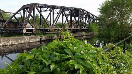 Keywords: old bridge water river green plant
