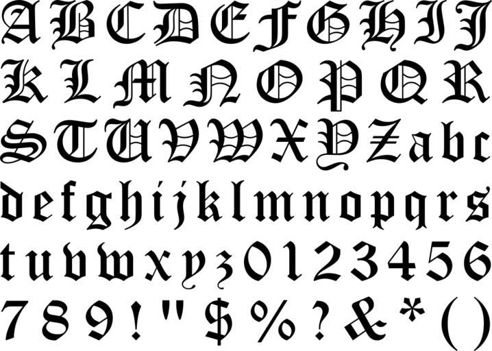 Keywords: Old English typeface.svg An example Old English typeface called Blackletter El alfabeto en Letra Gótica DarkEvil 2007-11-03 DarkEvil Blackletter Latin alphabet charts