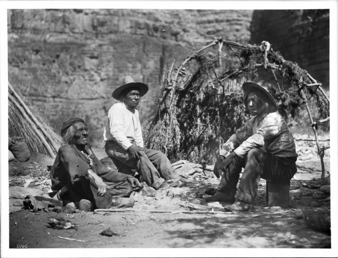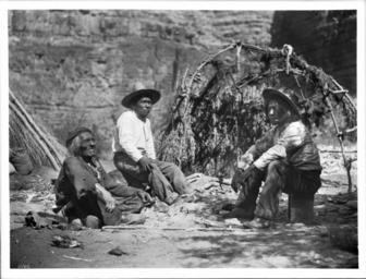 Keywords: Old Havasupai Indian man telling stories to two other men sitting around a campfire, ca.1899 (CHS-3790).jpg en <br> Old Havasupai Indian man telling stories to two other men sitting around a campfire ca 1899 Photograph of an old Havasupai Indian man telling stories to two other men sitting around a campfire ca 1899 He sits crosslegged on the ground at left The other two men sit on small objects a rock a box close to the ground They both wear hats; whereas the old man wears a cloth wrapped around his head Behind them stands the rough lattice wood framework of a small dome-shaped structure A vertical canyon wall is in the background Call number CHS-3790 Photographer James George Wharton Filename CHS-3790 Coverage date circa 1899 Part of collection California Historical Society Collection 1860-1960 Type images Part of subcollection Title Insurance and Trust and C C Pierce Photography Collection 1860-1960 Repository name USC Libraries Special Collections Format glass plate negatives Microfiche number 1-167- Archival file chs_Volume95/CHS-3790 tiff Repository address Doheny Memorial Library Los Angeles CA 90089-0189 Geographic subject country USA Format aacr2 2 photographs glass photonegative photoprint b w ; 17 x 22 cm Rights Digitally reproduced by the USC Digital Library; From the California Historical Society Collection at the University of Southern California Subject adlf tribal areas Project USC Accession number 3790 Repository email specol usc edu Contributing entity California Historical Society Date created circa 1899 Publisher of the digital version University of Southern California Libraries Format aat photographic prints; photographs Legacy record ID chs-m16375; USC-1-1-1-13517 Access conditions Send requests to address or e-mail given Phone 213 821-2366; fax 213 740-2343 Subject file heading Indians -- Havasupai Subject lcsh Indians of North America; Havasupai Indians; Men; Storytellers; Clothing and dress Subject Havasupai Indians circa 1899 date created James George Wharton http //digitallibrary usc edu/cdm/ref/collection/p15799coll65/id/16314 PD-old-70-1923 Images from USC Digital Library uploaded by Fæ California Historical Society Collection 1860-1960 Glass plate negatives Havasupai Photographs by George Wharton James |