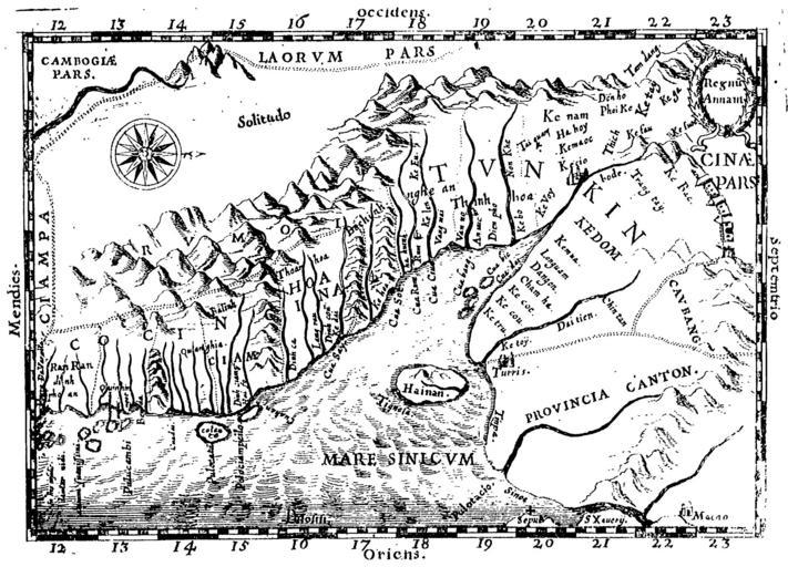 | Keywords: Old map of Vietnam.jpg Early Western Map of Tonkin 1651 One of the earliest Western maps showing details of northern and central Vietnam appeared in Father Alexander de Rhodes's Histoire dv royavme de Tvnqvin published in Rome in 1650 This map is from the French edition published a year later in Lyon Oriented with the north to the right Regnu Annam shows the extent of seventeenth-century Vietnam then divided between two rival dynasties one in the north and the other in central Vietnam Remnants of the Cham kingdom eventually destroyed by the Vietnamese still exist in the south To the west are the highlands occupied by Rumoi upland minority groups later called montagnards by the French The limited Western knowledge of the interior is illustrated by the large region labeled Solitudo originally from http //www loc gov/rr/asian/guide/guide-southern html High-resolution version from http //gallica bnf fr/ark /12148/bpt6k54392965 image r 19 f19 pagination The BNF PD-old Old maps of Vietnam Maps of Champa Kingdom of Annam Alexandre de Rhodes |
