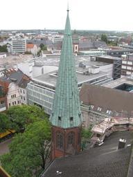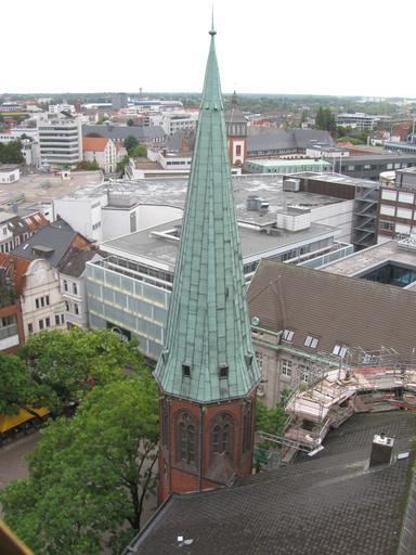 Keywords: Oldenburg Lambertikirche Treppenturm.JPG en Oldenburg Lower Saxony Germany View from the bell tower of St Lambert Church to one of the stair towers of the church and the market place de Oldenburg Oldb Lambertikirche Blick vom Glockenturm auf einen der vier großen Treppentürme Es handelt sich um den nordöstlichen Turm Links davon der Marktplatz own Anaconda74 2013-09-08 Oldenburg Lambertikirche Copper roofs in Lower Saxony Stair towers in Germany Cc-zero