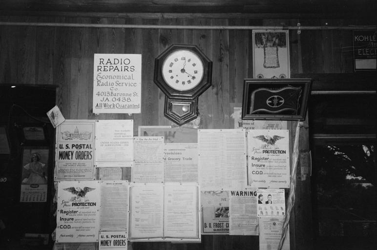 | Keywords: Olga LA General Stoe Clock Posters.jpg Posters and decorations in combined general store and post office Olga Louisiana 1938 Note Olga was a town across the Mississippi River from Boothville in Plaquemines Parish Photo by Russell Lee for the Farm Security Administration; transfered to Office of War Information Photograph Collection and then to Library of Congress; downloaded via http //www loc gov/pictures/item/fsa1997024474/PP/ 1938-09 Creator Russell Lee PD-USGov 1938 in Louisiana Olga Louisiana Interiors of shops in Louisiana Russell Lee General stores in the United States Clocks in Louisiana Time 00 20 |