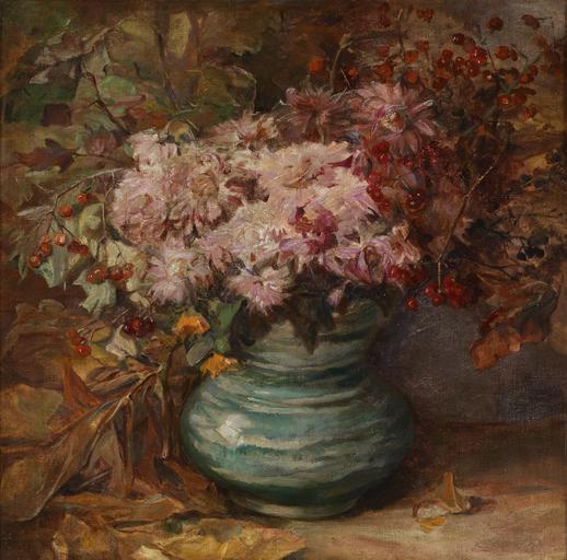 Keywords: Olga Wisinger-Florian Blumenstrauß mit Crysanthemen und Ringelblumen.jpg Blumenstrauß mit Crysanthemen und Ringelblumen in einer Vase oil on canvas rückseitig Nachlassstempel Olga Wisinger-Florian 43 x 43 cm http //www dorotheum com by 1926 Creator Olga Wisinger-Florian PD-old-auto 1926 Images from Dorotheum Olga Wisinger-Florian Still life paintings of flowers