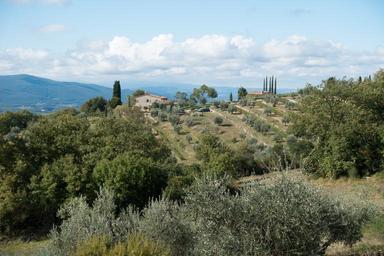 Keywords: olive tree cypress farm landscape cultural landscape agriculture farmhouse home nature rural building hill mountains sky blue tuscany italy
