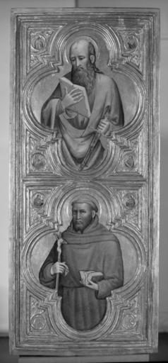 | Keywords: Olivuccio di Ciccarello da Camerino - Madonna and Child with Saints Peter, Paul, John the Baptist, and Francis - Walters 37699 - Front Right.jpg The intact condition and unique format of this altarpiece make it a truly remarkable painting The central panel depicts a stunning Madonna and Child flanked on the left by half-length figures of St Peter above St John the Baptist and on the right by St Paul above St Francis of Assisi The Virgin's robe is carved and decorated with gold leaf that shimmered in the candlelight a surface treatment common in Byzantine paintings Because of the crescent moon at her feet the rays emanating from her body and the gold curling through her cloak the Virgin seems to hover behind the frame The molding of the inner frame crops the composition like an open window offering a glimpse into the sacred timeless realm beyond On the back of the left wing are two preparatory drawings by the artist For more information on this piece please see Zeri catalogue number 41 pp 68-71 ca 1410 1420 Medieval oil and gold leaf on panel Central panel H including frame 63 x W 30 3/8 x D 1 1/4 in 160 x 77 2 x 3 1 cm ; Left wing H including frame 63 1/4 x W 27 9/16 x D 1 1/4 in 160 6 x 70 x 3 1 cm ; Right wing H including frame 63 5/16 x W 27 5/16 x D 1 1/4 in 160 8 x 69 3 x 3 1 cm accession number 37 699 22289 Don Marcello Massarenti Collection Rome prior to 1897 mode of acquisition unknown 1897 catalogue no 30 as Tuscan School early 15th century Henry Walters city Baltimore Walters Art Museum Henry Walters Acquired by Henry Walters with the Massarenti Collection 1902 Transcription Inscribed on Virgin's halo AVE MARIA GRATIA PLENA; Translation Inscribed on Virgin's halo Hail Mary full of grace; Transcription Inscribed on the bottom left panel in two roundels P E; Transcription Inscribed on bottom of right panel in two roundels T R; Inscribed on scroll held by John the Baptist ECCE/AGNVS/DEI QVI/TOLLIS/PECCATA MVNDI; Translation Inscribed on scroll held by John the Baptist Here is the Lamb of God who eliminates the sins of the world God's Minstrel St Francis of Assisi The Walters Art Gallery Baltimore 1982 place of origin Marche Italy Walters Art Museum license 2D Medieval art in the Walters Art Museum Olivuccio di Ciccarello da Camerino Paintings in the Walters Art Museum Madonna and Child |