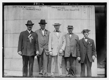 | Keywords: Olvany 4101089538 9c4b2723e3 o.jpg en wikipedia 2012 January 12 Bain News Service publisher Samuel Becket Boyd II George Washington Olvanny Kelly Henry Clemons Bunker and George O Luce in 1913 in New York City They may have been meeting for the dedication of the Firemen's Memorial in Riverside Park in Manhattan in New York City on September 5 1913 Note that they have shared pins and pennants with each other 1 negative glass ; 5 x 7 in or smaller Notes Title from unverified data provided by the Bain News Service on the negatives or caption cards Forms part of George Grantham Bain Collection Library of Congress Format Glass negatives Rights Info No known restrictions on publication Repository Library of Congress Prints and Photographs Division Washington D C 20540 USA hdl loc gov/loc pnp/pp print General information about the Bain Collection is available at hdl loc gov/loc pnp/pp ggbain Persistent URL hdl loc gov/loc pnp/ggbain 14085 Call Number LC-B2- 2811-6 ggbain 14085 en wikipedia 2009-11-19 Richard Arthur Norton 1958- wikipedia en Cropped images multiple image center center Samuel Becket Boyd II 1865-1929 circa 1913 in Manhattan png Henry Clemons Bunker 1856-1938 circa 1913 in Manhattan png George Washington Olvany 1876-1952 circa 1913 in Manhattan png clear People Samuel Becket Boyd II 1865-1929 was the fire chief of Knoxville Tennessee who died of a heart attack in the line of duty in 1929 Henry Clemons Bunker 1856-1938 was the fire chief of Cincinnati Ohio from 1912 to 1916 George Washington Olvany 1876-1952 was the deputy fire chief of New York City New York George O Luce 1876-1922 was the fire chief of Ilion New York in 1918 In the image he is incorrectly identified as being from Knoxville Tennessee but the fire chief of Knoxville is already identified George Kelly fireman of Bismarck North Dakota George Washington Olvany 1876-1952 He was the deputy New York City Fire Commissioner and leader of Tammany Hall <ref name time> cite news Death of Brennan http //www time com/time/magazine/article/0 9171 881173 00 html George Washington Olvany under the careful guidance of Governor Smith has succeeded Tammany Boss Murphy Frank Hague is in power in New Jersey Time magazine August 20 1928 2009-08-18 </ref> He resigned from Tammany Hall in 1929 <ref> cite news Olvany Out http //www time com/time/magazine/article/0 9171 846323 00 html ixzz0XLPpCjRc 'Because of ill health and on advice of physicians I resign as leader of Tammany Hall George W Washington Olvany ' Time magazine March 25 1929 2009-11-19 </ref> Samuel Becket Boyd II 1865-1929 He was born on March 20 1865 in Abingdon Virginia to Samuel Becket Boyd I 1828-1890 and Isabella Reed 1831-1907 <ref name obit/><ref> cite web http //dlc lib utk edu/spc/view docId ead/0012_002387_000000_0000/0012_002387_000000_0000 xml Samuel Becket Boyd papers 2015-05-14 University of Tennessee </ref> He married Julia Harrison 1881-1957 around 1852 He joined the fire department in 1900 <ref name obit/> He died on March 29 1929 of a heart attack in Knoxville Tennessee after a fire while in route to the hospital <ref name obit> cite news Funeral Services to Be Held Monday for Chief Boyd Died After Collapse After Fire http //www findagrave com/cgi-bin/fg cgi page pv GRid 62597802 PIpi 109179018 Knoxville News Sentinel March 30 1929 2015-05-14 </ref> He was buried in the Old Gray Cemetery in Knoxville Tennessee George O Luce 1876-1922 George received his basic education in the Ilion schools where he excelled in tool making This landed him a job at the Remington Arms Company where he worked at this trade His father had opened and operated a wholesale liquor establlishment and at the time of his father's passing he gave up his job at Remington to take over the business as the manager He held this position until 1918 when he became the elected fire chief of Ilion He had always been interested and involved in fire fighting While at Remington he was the chief of the fire brigade He would remain with the fire department the rest of his life belonging to numerous fire associations such as the New York State Fire Chief's Association and the International Fire Chief's Association He was active in the Catholic church the Elks 1444 and Nikomas Tribe of the Improved Order of Red Men at Ilion Henry Clemons Bunker 1856-1938 He was the fire chief of Cincinnati Ohio from 1912 to 1916 References reflist PD-Bain Original upload log page en wikipedia Olvany_4101089538_9c4b2723e3_o jpg 2009-11-19 21 35 Richard Arthur Norton 1958- 1024×749× 140499 bytes <nowiki>Bain News Service publisher Boyd George Washington Olvanny Kelly Bunker Luce between ca 1910 and ca 1915 1 negative glass ; 5 x 7 in or smaller Notes Title from unverified data provided by the Bain News Service on the negatives o</nowiki> Black and white group photographs of men Black and white photographs in the 1910s 1913 in New York City Samuel Becket Boyd II George Washington Olvany George Grantham Bain Collection |