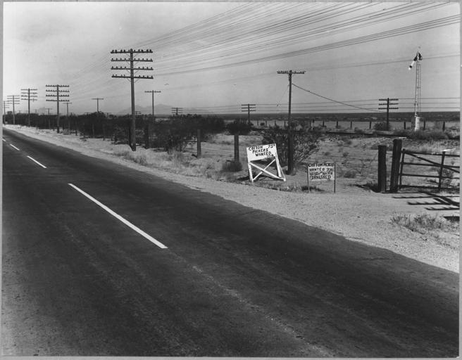 | Keywords: On Highway 80, Maricopa County, Ariz. Ranch advertisement during cotton harvest. Highway signs read . . . - NARA - 522217.jpg Scope and content Full caption reads as follows On Highway 80 Maricopa County Ariz Ranch advertisement during cotton harvest Highway signs reading cotton pickers wanted are but the last stage in the process of attracting seasonal laborers to Arizona from areas as remote as Yakima Valley Washington and the bootheel of Missouri General notes 522217 Local identifier 83-G-44048 Department of Agriculture Bureau of Agricultural Economics Division of Economic Information ca 1922 - ca 1953 NARA-Author Lange Dorothea 1895-1965 Photographer 1372774 <br /> Still Picture Records Section Special Media Archives Services Division NWCS-S National Archives at College Park 8601 Adelphi Road College Park MD 20740-6001 11/1940 Record group Record Group 83 Records of the Bureau of Agricultural Economics 1876 - 1959 Record group ARC 412 Photographic Prints Documenting Programs and Activities of the Bureau of Agricultural Economics and Predecessor Agencies compiled ca 1922 - ca 1947 documenting the period ca 1911 - ca 1947 Series ARC 521048 File unit File unit ARC Variant control numbers NAIL Control Number NWDNS-83-G-44048 Other versions <gallery> File On_Highway_80 _Maricopa_County _Ariz _Ranch_advertisement_during_cotton_harvest _Highway_signs_read_ _ _ _-_NARA_-_522217 tif tif File On_Highway_80 _Maricopa_County _Ariz _Ranch_advertisement_during_cotton_harvest _Highway_signs_read_ _ _ _-_NARA_-_522217 jpg jpg </gallery> NARA-cooperation PD-USGov Dorothea Lange Maricopa County Arizona |