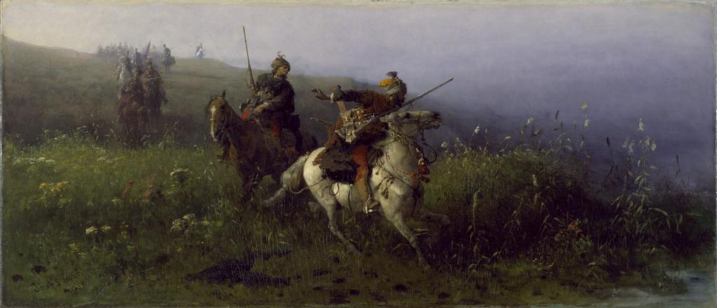 | Keywords: On Reconnaissance, Józef Brandt, 1876.jpg Brandt a painter of military campaigns and eastern European trail scenes in which horses serve as a recurring motif distinguished himself as the leader of the Munich school of Polish painters an informal band of realists of Polish origin active in Munich in the 1870s In search of exotic subjects he frequently traveled eastward visiting Ukraine and the European parts of Turkey A consummate painter of horses Brandt shows a procession of Tartar horseman proceeding across a grassy plain dotted with colorful wildflowers The figure on a dapple horse in the central foreground startled by something in the rushes at the right halts brandishes his rifle and raises his hand to caution his companion In the background the rest of the group rides across the hill toward the two figures in the foreground The horsemen wear bright red pants boots and turbans with feathers; the turban of the man on the dapple horse is a particularly brilliant saffron Along with the rifles they carry each has additional weapons around their waists including bows and axes The reins and saddles of the horses are embellished by beads and decorative metalwork 1876 oil on canvas cm 47 6 113 7 ; framed cm 68 6 132 1 10 8 accession number 37 2569 36187 Mr and Mrs L Whiting Farinholt Gibson Island Maryland Walters Art Museum Gift of Mr and Mrs L Whiting Farinholt 1980 Josef Brandt 1876 at lower left The Orientalists The Walters Art Gallery Baltimore 1987-1988 place of origin France PD-old-auto 1915 Józef Brandt Paintings in the Walters Art Museum Red trousers |
