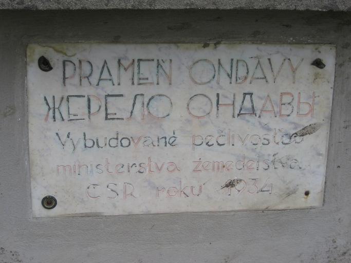 | Keywords: Ondava spring 2.jpg Ondava spring in the village of Ondavka Bardejov county Slovakia The table says Ondava spring in Slovak and Rusyn Built by Ministry of Agriculture of Czechoslovak Republic in 1934 Źródło Ondavy we wsi Ondavka powiat bardejovski Słowacja own 5 VIII 2006 User PM / pl Wikipedysta P Ondava Springs of Slovakia Plaques referencing 1934 Multilingual signs in Slovakia |