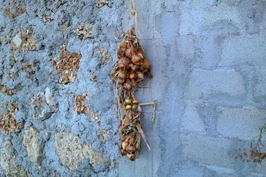 Keywords: onions onion bulbs bunch vegetable food natural drying hanging wall