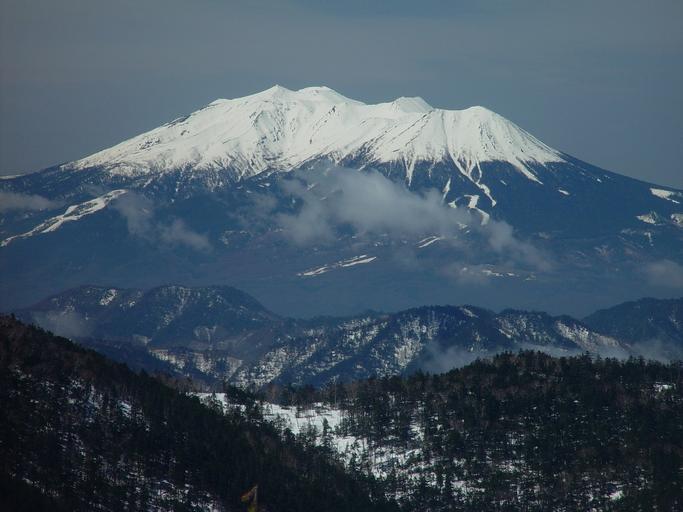 Keywords: Ontakesan from Hachimoriyama 2008-4-25.JPG Mount Ontake from Mount Hachimori in Nagano pref Japan 鉢盛山から 御嶽山 右手前は継子岳(日和田富士) own Alpsdake 2008-04-25 Mount Ontake Views from Mount Hachimori