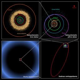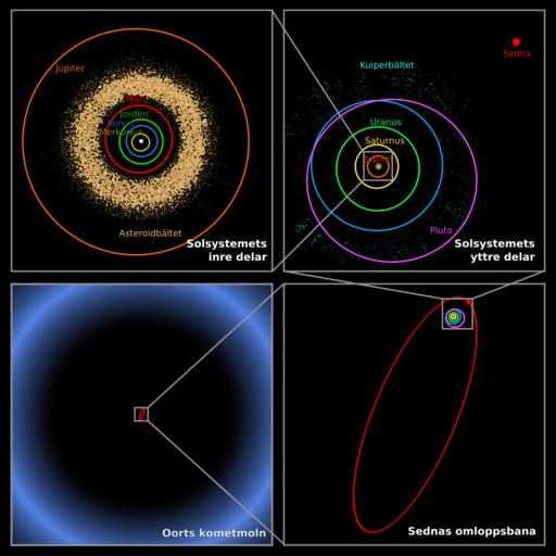 Keywords: Oort cloud Sedna orbit-sv.svg These four panels show the location of trans-Neptunian object 90377 Sedna which lies in the farthest reaches of the Solar system Each panel moving clockwise from the upper left successively zooms out to place Sedna in context The first panel shows the orbits of the inner planets and Jupiter; and the asteroid belt In the second panel Sedna is shown well outside the orbits of Neptune and the Kuiper belt objects Sedna's full orbit is illustrated in the third panel along with the object's location in 2004 nearing its closest approach to the Sun The final panel zooms out much farther showing that even this large elliptical orbit falls inside what was previously thought to be the inner edge of the spherical Oort cloud a distribution of cold icy bodies lying at the limits of the Sun's gravitational pull Sedna's presence suggests that the previously speculated inner disk on the ecliptic does exist Oort_cloud_Sedna_orbit svg 2010-01-23 17 27 UTC Oort_cloud_Sedna_orbit svg Image courtesy of NASA / JPL-Caltech / R Hurt Original text courtesy of NASA / JPL-Caltech SVG conversion by Holek derivative work DJ Tricky <span class signature-talk >talk</span> Swedish translation DJ Tricky Oort_cloud_Sedna_orbit svg Oort cloud Sedna |