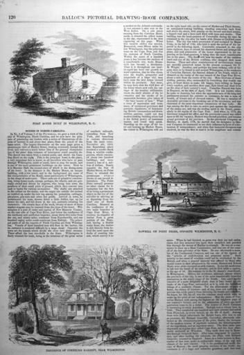 | Keywords: blackandwhite monochrome outdoor black and white Appeared in ca. 1855 issue of Ballou's Pictorial Drawing-Room Companion. Original print includes the following sketches: First House Built in Wilmington, N.C. (4 1/2 x 3 7/8), showing crude dwelling located just north of Wilmington with woman standing at entrance; Sawmill on Point Peter, Opposite Wilmington (4 15/16 x 3 7/8), showing mill, mill workers, wagon, and ship docked at rear of building; and Residence of Cornelius Harnett, Near Wilmington (6 3/16 x 4 7/16), showing residence with man on horseback. Original print includes text. From Original Prints, Audio Visual Materials, Special Collections, State Archives of North Carolina. Appeared in ca. 1855 issue of Ballou's Pictorial Drawing-Room Companion. Original print includes the following sketches: First House Built in Wilmington, N.C. (4 1/2 x 3 7/8), showing crude dwelling located just north of Wilmington with woman standing at entrance; Sawmill on Point Peter, Opposite Wilmington (4 15/16 x 3 7/8), showing mill, mill workers, wagon, and ship docked at rear of building; and Residence of Cornelius Harnett, Near Wilmington (6 3/16 x 4 7/16), showing residence with man on horseback. Original print includes text. From Original Prints, Audio Visual Materials, Special Collections, State Archives of North Carolina. |