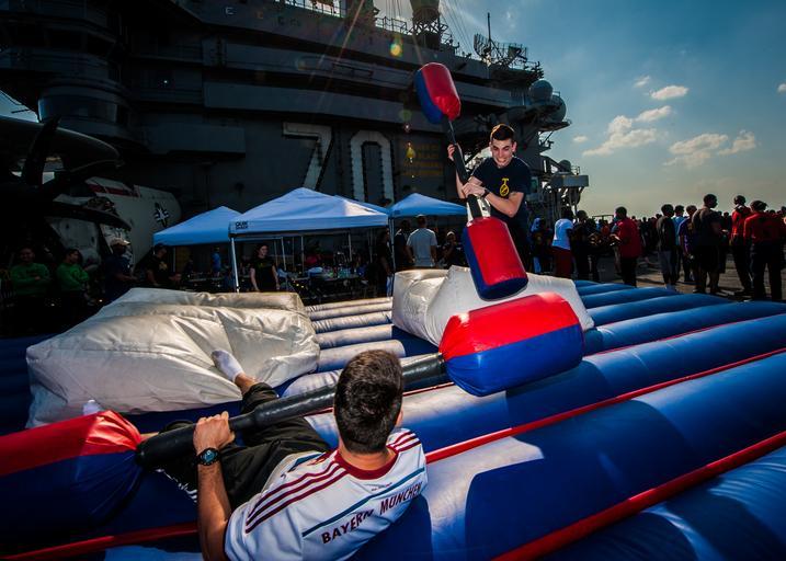 | Keywords: Operation Inherent Resolve 141102-N-WD464-057.jpg en Sailors fight with pugil sticks on the flight deck of the Nimitz-class aircraft carrier USS Carl Vinson during a steel beach picnic Carl Vinson is deployed in the U S 5th Fleet area of operations supporting Operation Inherent Resolve strike operations in Iraq and Syria as directed maritime security operations and theater security cooperation efforts in the region 2014-11-02 CVN 70 https //www dvidshub net/image/1641876 141102-N-WD464-057 2014-11-03 19 36 USS CARL VINSON CVN 70 AT SEA PD-USGov-Military-Navy USS Carl Vinson CVN-70 Pugil sticks Images from DoD uploaded by Fæ |