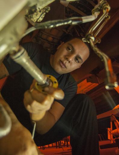 | Keywords: Operation Inherent Resolve 150103-N-TP834-097.jpg en Aviation Structural Mechanic 3rd Class Eliazer Baez of the Mighty Shrikes of Strike Fighter Squadron VFA 94 conducts maintenance on the main landing gear of an F/A-18C Hornet aboard the aircraft carrier USS Carl Vinson CVN 70 The Carl Vinson Carrier Strike Group is currently deployed to the area supporting maritime security operations strike operations in Iraq and Syria as directed and theater security cooperation efforts in the 5th Fleet AOR U S Navy photo by Mass Communication Specialist 2nd Class John Philip Wagner Jr /Released 2015-01-03 Petty Officer 2nd Class john wagner https //www dvidshub net/image/1713778 150103-N-TP834-097 2015-01-04 19 48 USS CARL VINSON AT SEA PD-USGov-Military-Navy F/A-18C Hornet USS Carl Vinson CVN-70 Images from DoD uploaded by Fæ |