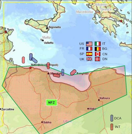 Keywords: Operation Odyssey Dawn - No Fly Zone - Libya March 2011.jpg Operation Odyssey Dawn in Libya 2011 No Fly Zone NFZ US Vice Admiral Bill Gortney Director of The Joint Staff Here is a good depiction of what the no-fly zone looks like right now You can see we ™ve got essentially seven patrol stations over the Mediterranean from which the aircraft staged themselves before being called to enforce the U N mandate Some of these missions are what we call defensive combat air DCA You can see the patrol stations for these missions depicted in blue These are missions designed solely to keep the airspace free of Libyan combat aircraft and all of these missions are now being flown by our partner nation pilots The other patrol stations depicted in red are designed for interdiction missions INT meaning these strikes conduct -- are conducted at ground targets either fixed or moving The United States is flying about half of all of these missions You can also see the no-fly zone as it exists today running coast to coast across the northern part of the country and extending further south As I mentioned before one of the airstrikes we conducted last night took out some SA-2 and SA-3 surface-to-air missile sites down in Sebha You can also get a sense here of the international contributions to the no-fly zone mission More than 350 aircraft are involved in some capacity either enforcing the no-fly zone or protecting the civilian populace Only slightly more than half belong to the United States It ™s fair to say that the coalition is growing in both size and capability every day Today there are nine other contributing nations to include Qatar and thousands of coalition military personnel involved in this effort They ™re deployed across Europe and on the Mediterranean at bases ashore and on any of one of the 38 ships at sea http //www defense gov/transcripts/transcript aspx transcriptid 4798 http //www defense gov/news/d20110324pptslides pdf 2011-03-24 U S Department of Defense Office of the Assistant Secretary of Defense Public Affairs PD-USGov Operation Odyssey Dawn Maps of the 2011 Libyan civil war Airspace |